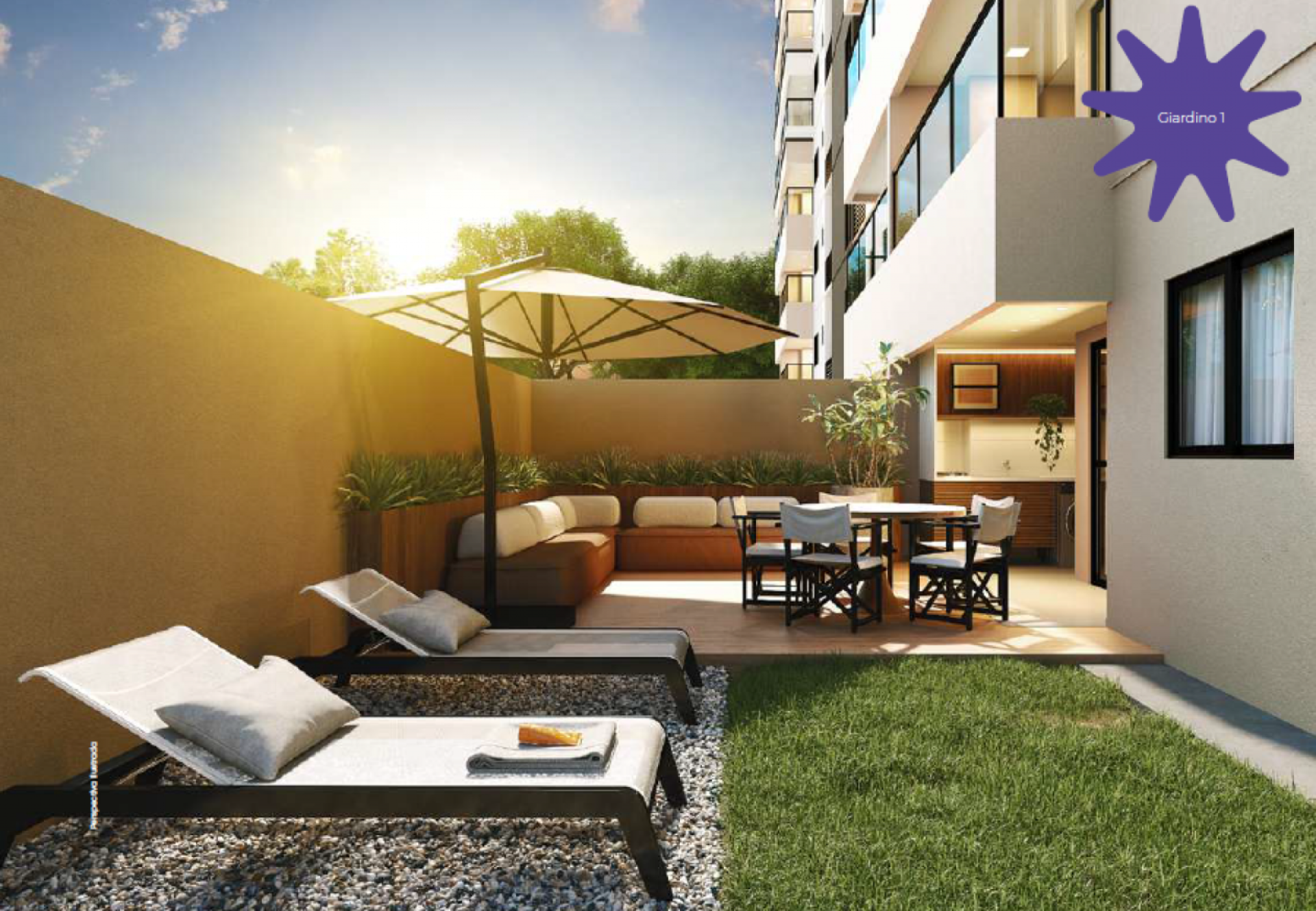 - Apartamentos de 2 ou 3 quartos com suíte e giardino, área privativa de 68,17m², 72,43m², 80,77m², 82,45m², 89,20m², 108,37m², 111,11m², 145,45m² e 151,15m².