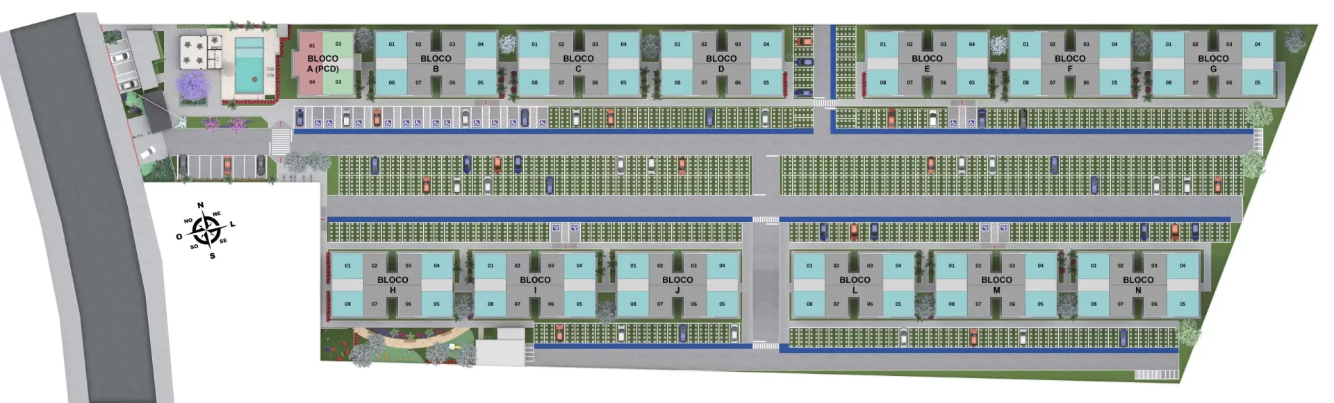 - Unidades por andar: 08 unidades por pavimento nos blocos B ao N e 04 unidades por pavimento no bloco A (PCD) com exceção do pavimento térreo, onde teremos 03 unidades.