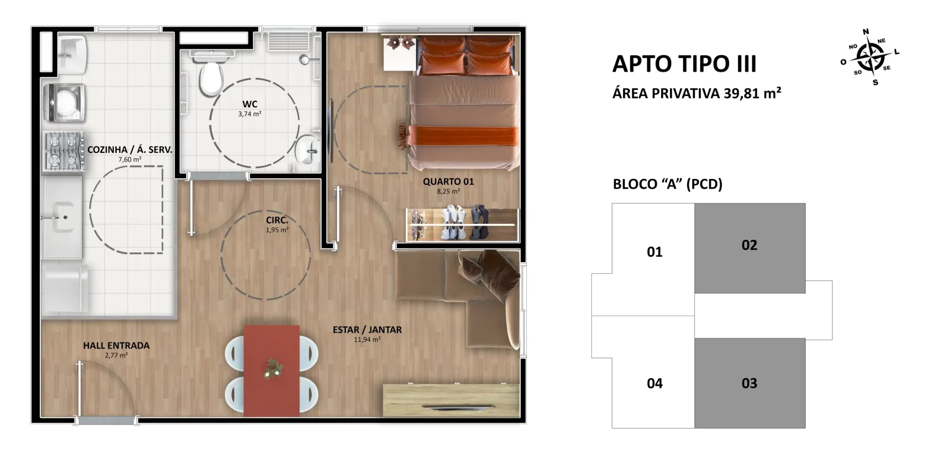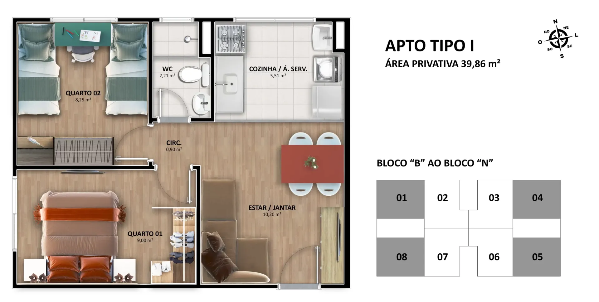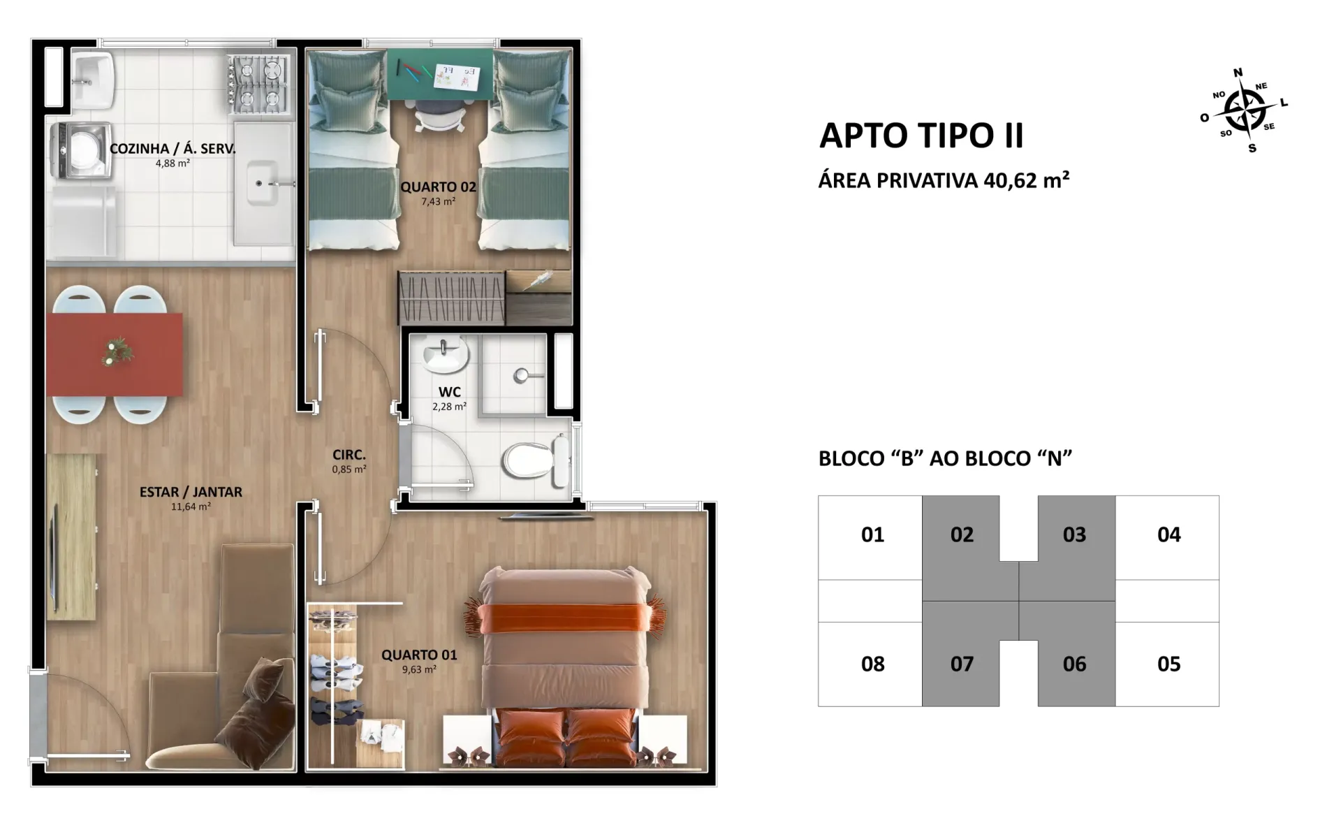 - Tipologia das unidades: Apartamentos de 2 quartos e área privativa de 39,86m² e 40,62m². Apartamentos de 1 quartos e área privativa de 39,81m² e 40,59m²;